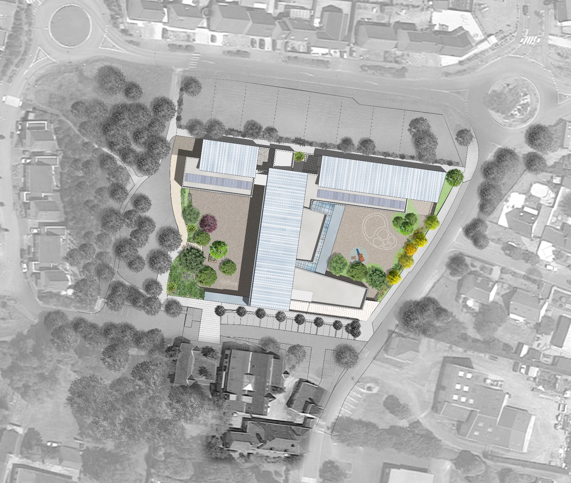 Face au dénivelé conséquent du site et aux remodelages du terrain en partie induits par le programme (démolition du vieux moulin, dépose d'une servitude I4, dépollution), nous avons pris le parti de proposer un jeu de niveaux assurant à l'élémentaire, comme à la maternelle, une cour de plain-pied. En effet, le niveau supérieur est rendu accessible par la rue de Bellevue via une rampe en béton balayé longeant le trottoir piéton du nouveau tronçon de voirie. Le hall commun aux deux écoles offre une répartition en étoile optimisant les accès aux différentes entités de l'administration, de l'ALSH et à l'escalier descendant au Rez-de-jardin supportant l'élémentaire.