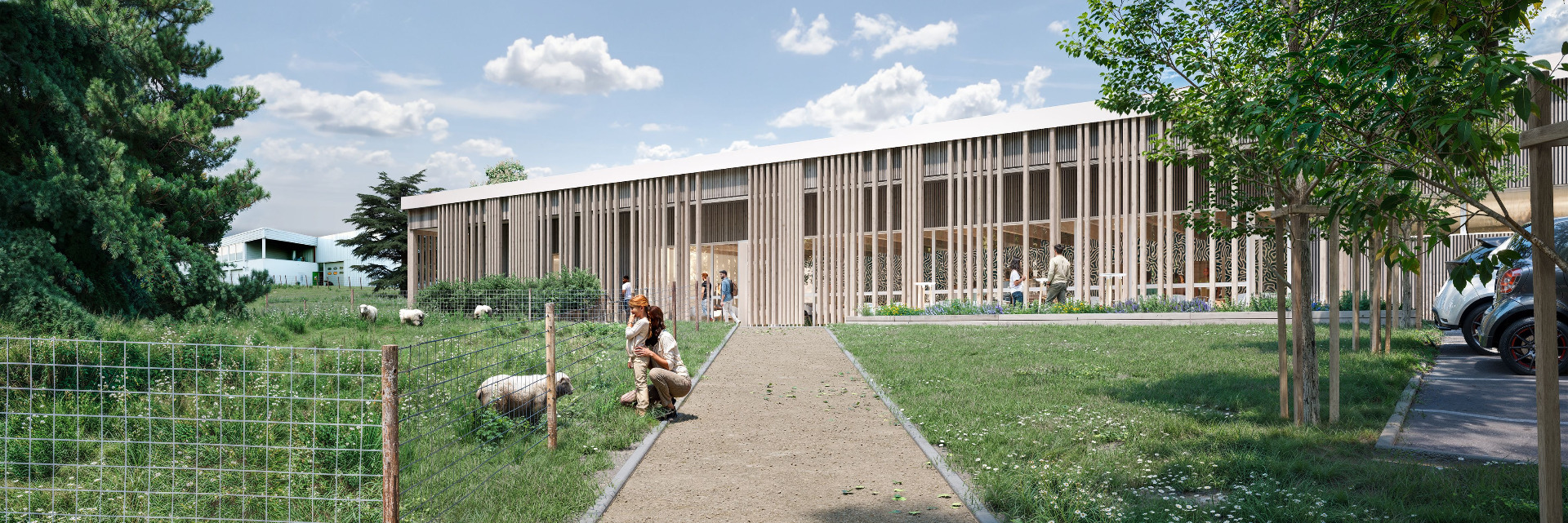 Desservi par la route de Bréhadour, le nouvel accès clientèle et logistique est élargi et sécurisé pour permettre le passage de véhicules de gabarit conséquent. Afin de régler les problématiques d'accès aux serres pour les engins, nous avons privilégier un nivellement de l'ensemble de la plateforme à la côte +/- 36,00 NGF. Ce choix nous permet de garantir des accès simplifiés pour les engins d'exploitation, sans générer de frais de maintenance. La surélévation du terrain naturel, permet de proposer un sous-sol technique (sous-station, CTA et ECS) et un vide-sanitaire facilitant l'accès aux équipements de plomberie de la zone cuisine. Les cuves de rétention des eaux pluviales récoltées par la toiture seront enterrées sous la voirie séparant les serres horticoles du bâtiment neuf.
